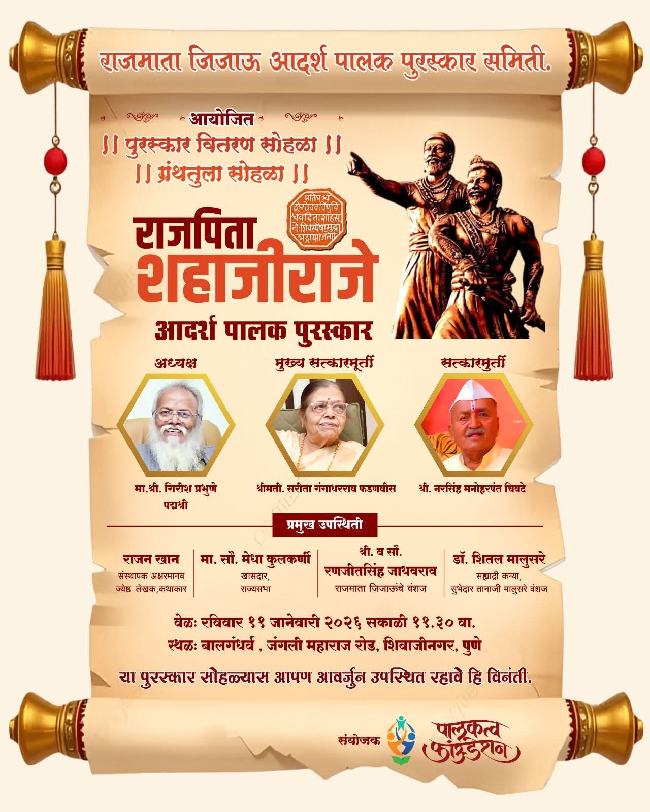 करमाळा (सोलापूर) : पालकत्व फाउंडेशन राजमाता जिजाऊ आदर्श पालक पुरस्कार समितीच्या वतीने पुणे येथील बालगंधर्व मंदिरात रविवारी (ता. 11) सकाळी 11 वाजता ‘राजपिता शहाजीराजे आदर्श पालक पुरस्कार’ वितरण सोहळा होणार आहे.
