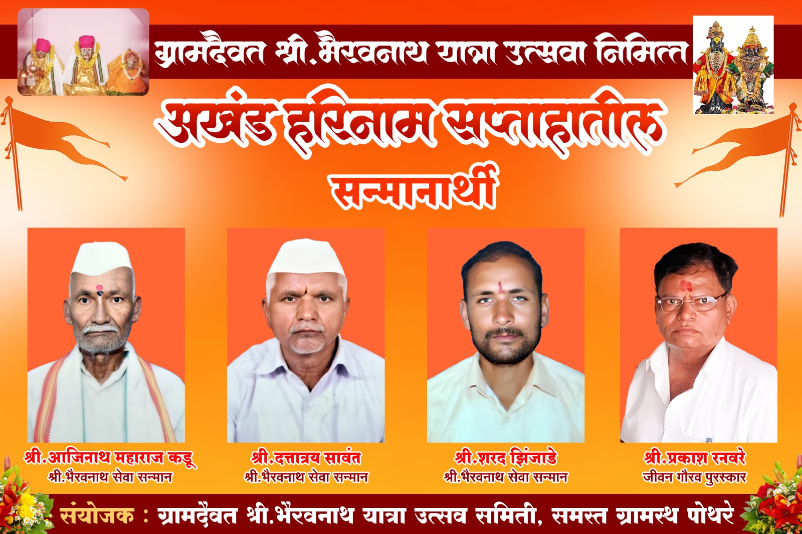 करमाळा (अशोक मुरूमकर) : पोथरे येथे ग्रामदैवत श्री भैरवनाथ यात्रा उत्सव समिती व ग्रामस्थांच्या वतीने आज (मंगळवारी) सायंकाळी चौघांचे विशेष सन्मान होणार आहेत. ग्रामदैवत श्री भैरवनाथ यात्रा उत्सवानिमित्त आयोजित अखंड हरिनाम सप्ताहातील हे सन्मानार्थी आहेत. यामध्ये प्रकाश ननवरे यांचा ‘जीवनगैरव’ पुरस्कार देऊन सन्मान केला जाणार आहे. तर वायरमन शरद झिंजाडे, दत्तात्रय सावंत व अजिनाथ महाराज कडू यांचा ‘श्री भैरवनाथ सेवा सन्मान’ पुरस्काराने गौरवण्यात येणार आहे. ग्रामस्थांनी यावेळी उपस्थित राहण्याचे आवाहन संयोजकांनी केले आहे.