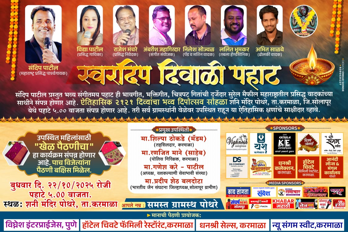 करमाळा (सोलापूर) : पोथरे येथील शनी मंदीरात बुधवारी (ता. २२) पहाटे ५ वाजता संदीप पाटील प्रस्तुत ‘स्वरदीप दिवाळी पहाट’ कार्यक्रम होणार आहे. यामध्ये भक्तीगीत, भावगीत, चित्रपट गीतांची सुरेल मैफिल रंगणार आहे. पार्श्वगायक संदीप पाटील यांच्यासह गायक विद्या पाटील, निवेदक राजेश मंचरे, संगीत संयोजक अंबरीश जहागीरदार, वादक निलेश सोजवळ, तबलावादक ललित भूमकर व ढोलकी वादक अमित साळवे हे कला सादर करणार आहेत. यावेळी उपस्थित महिलांसाठी ‘खेळ पैठणीचा’ हा कार्यक्रम होणार असून पाच विजेत्यांना बक्षीस दिले जाणार आहे.